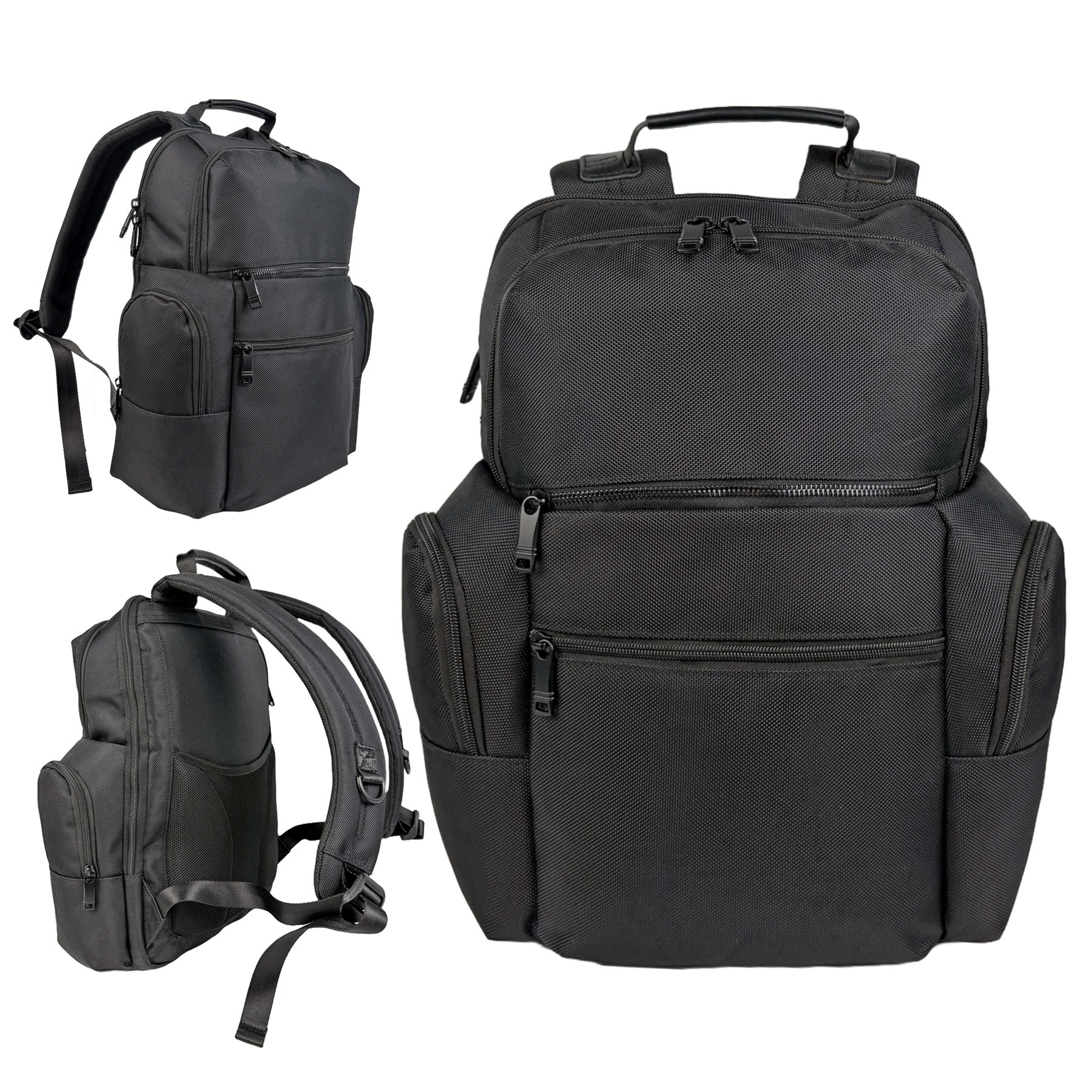 1680D ballistic polyester with full lining. Unique design with 2 full size zippered compartments. Main zippered compartment with gusset featuring gusseted padded laptop compartment, padded tablet & document sleeves and interior zipper pocket. 2 zipper front pockets. 2 large zipper side pockets. Built-in organizer & key holder in top front pocket. Durable metal zipper pulls. PU leather wrapped top carrying handle. Padded back panels for extra comfort & support. Padded adjustable shoulder straps with D rings. Padded add-a-bag smart sleeve. Uni brand metal plaque inside main compartment.